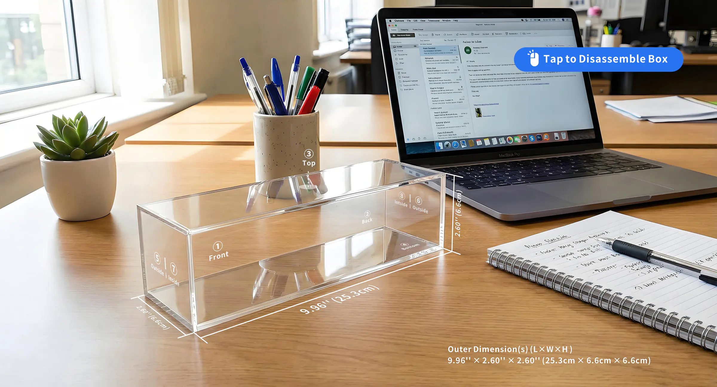 The size of the box after assembly:L9.96″ × H2.60″ × W2.60″(L25.3cm✕H6.6cm✕W6.6cm)