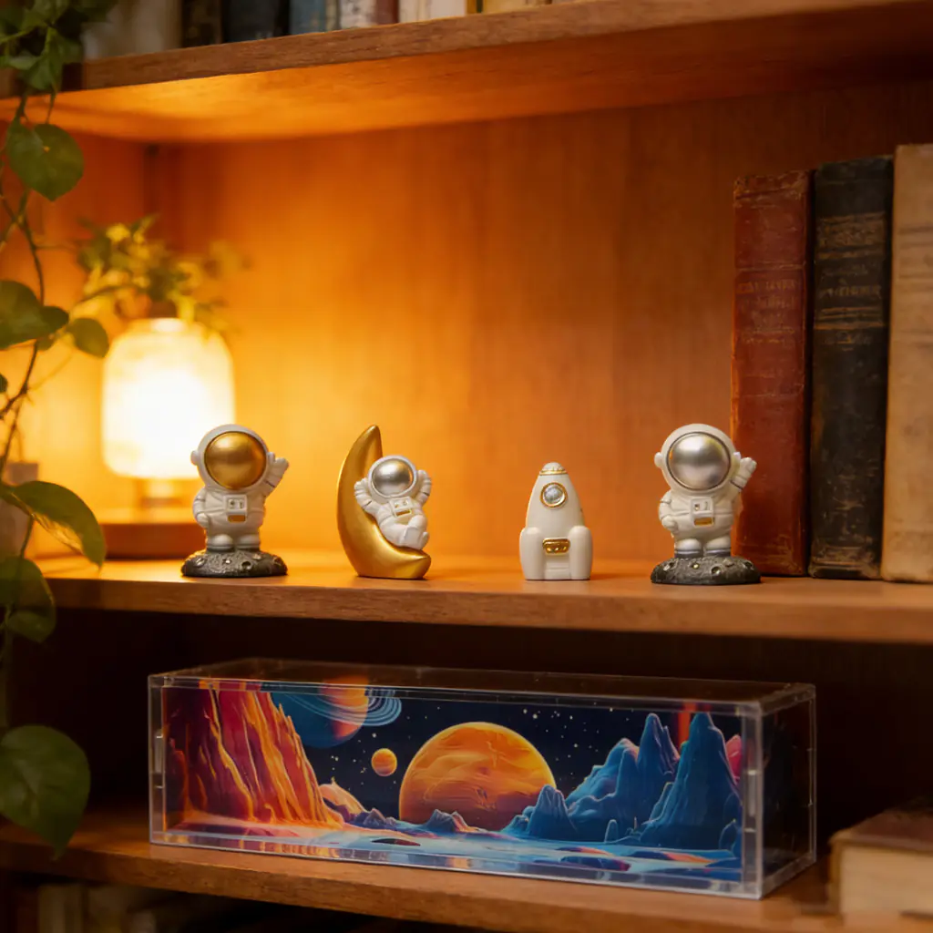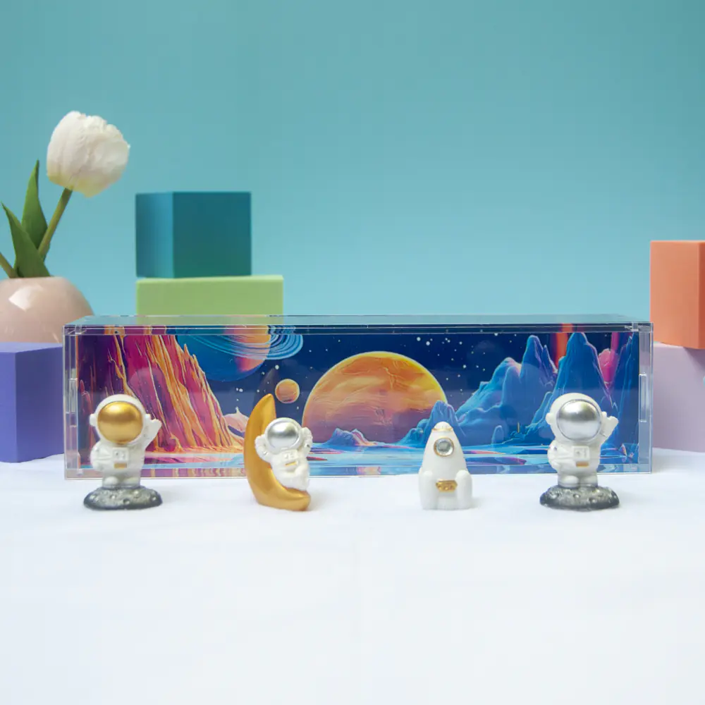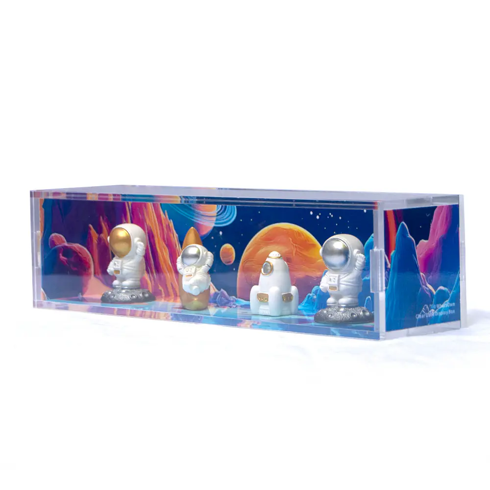 Clear display box / themed backdrop / Space figures / product packaging